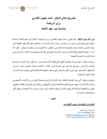 ةبسانم "داحتلاا دهع موي" لكشي " :ةضايرلا ريزو ،يسلافلا لوهلاب دمحأ .د يلاعم لاق - 2025 ويلوي 18 ،يبد
