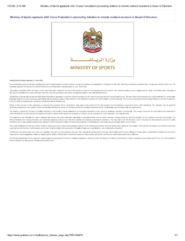 7/23/25, 9:14 AM Ministry of Sports applauds UAE Chess Federation's pioneering initiative to include resident members in Board of Directors