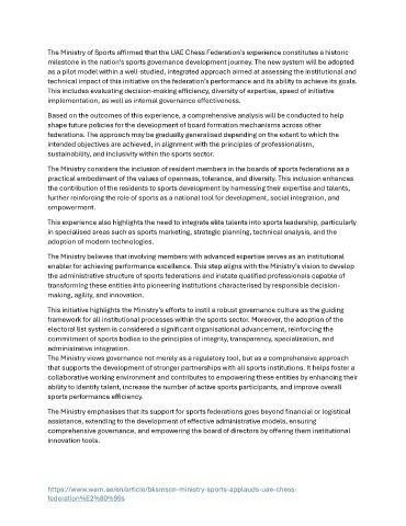 The Ministry of Sports affirmed that the UAE Chess Federation's experience constitutes a historic