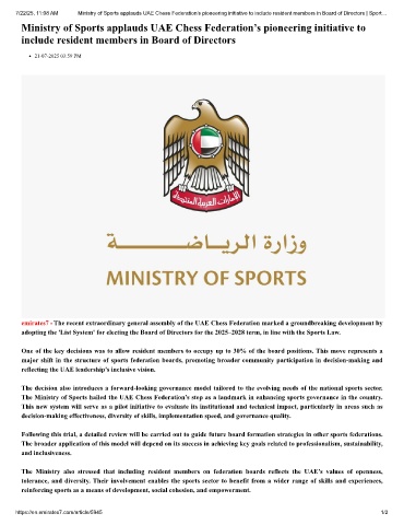 7/22/25, 11:08 AM Ministry of Sports applauds UAE Chess Federation’s pioneering initiative to include resident members in Board of Directors | Sport…