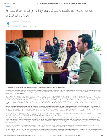 تﺪﻘﻋ ﺎﻤﻛ ،ﺔﯿﺷﺎﻘﻨﻟا تﺎﺴﻠﺠﻟا ﻲﻓ يﺮﻤﻟا ﻢﻧﺎﻏ ﻰﻨﻣ ﻦﯿﺴﻨﺠﻟا ﻦﯿﺑ نزاﻮﺘﻠﻟ تارﺎﻣﻹا ﺲﻠﺠﻣ ﺔﺴﯿﺋر ﺔﺒﺋﺎﻧ ﺖﻛرﺎﺷ ﺚﯿﺣ ،ﺔﻔﺜﻜﻣ ﺔﻄﺸﻧأ «ﺲﻜﯾﺮﺑ» ﺔﻋﻮﻤﺠﻤﺑ ةأﺮﻤﻟا نوﺆﺸﻟ يرازﻮﻟا عﺎﻤﺘﺟﻻا ﻲﻓ ةﺪﺤﺘﻤﻟا ﺔﯿﺑﺮﻌﻟا تارﺎﻣﻹا ﺔﻟود ﺔﻛرﺎﺸﻣ تﺪﮭﺷو
