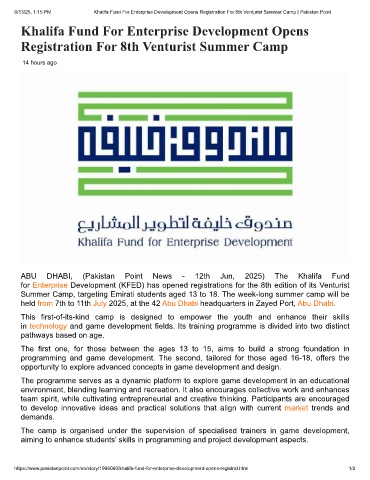 6/13/25, 1:15 PM Khalifa Fund For Enterprise Development Opens Registration For 8th Venturist Summer Camp | Pakistan Point
