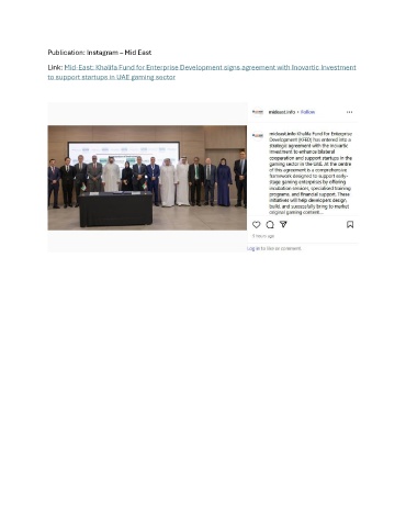 Publication: Instagram – Mid East Link: Mid-East: Khalifa Fund for Enterprise Development signs agreement with Inovartic Investment to support startups in UAE gaming sector
