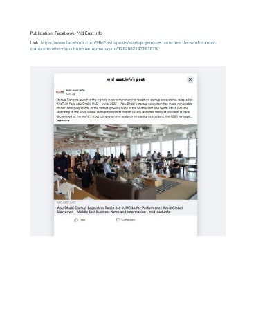 Publication: Facebook- Mid East Info Link: https://www.facebook.com/MidEast.i/posts/startup-genome-launches-the-worlds-most- comprehensive-report-on-startup-ecosyste/1282982147161879/