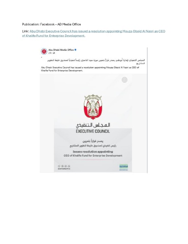 Publication: Facebook – AD Media Office Link: Abu Dhabi Executive Council has issued a resolution appointing Mouza Obaid Al Nasri as CEO of Khalifa Fund for Enterprise Development.