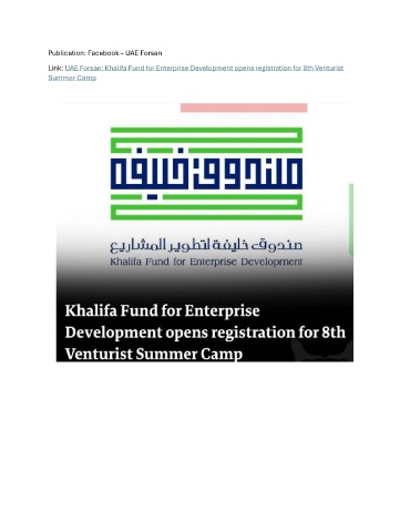 Publication: Facebook – UAE Forsan Link: UAE Forsan: Khalifa Fund for Enterprise Development opens registration for 8th Venturist Summer Camp