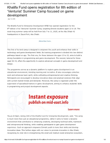 6/13/25, 1:11 PM Khalifa Fund opens registration for 8th edition of ‘Venturist’ Summer Camp focused on game development - Middle East Business …