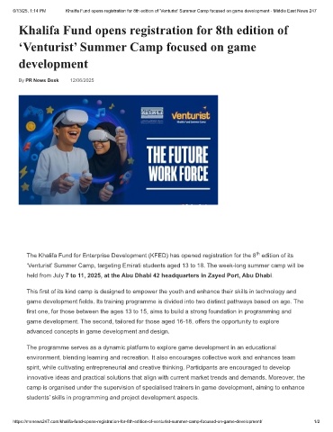 6/13/25, 1:14 PM Khalifa Fund opens registration for 8th edition of ‘Venturist’ Summer Camp focused on game development - Middle East News 247