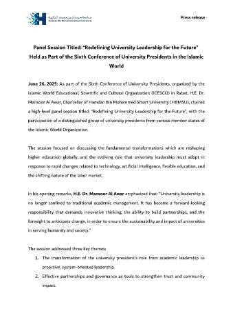 In his opening remarks, H.E. Dr. Mansoor Al Awar emphasized that: “University leadership is