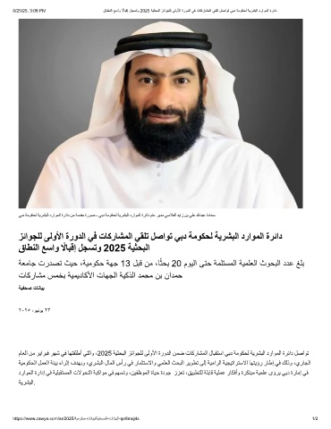 6/25/25, 3:08 PM قﺎطﻧﻟا ﻊﺳاو ً ﻻﺎﺑﻗإ لﺟﺳﺗو 2025 ﺔﯾﺛﺣﺑﻟا زﺋاوﺟﻠﻟ ﻰﻟوﻷا ةرودﻟا ﻲﻓ تﺎﻛرﺎﺷﻣﻟا ﻲﻘﻠﺗ لﺻاوﺗ ﻲﺑد ﺔﻣوﻛﺣﻟ ﺔﯾرﺷﺑﻟا دراوﻣﻟا ةرﺋاد