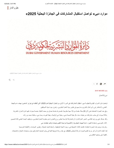 «2025 ﺔﯾﺛﺣﺑﻟا ةزﺋﺎﺟﻟا ﻲﻓ تﺎﻛرﺎﺷﻣﻟا لﺎﺑﻘﺗﺳا لﺻاوﺗ «ﻲﺑد دراوﻣ