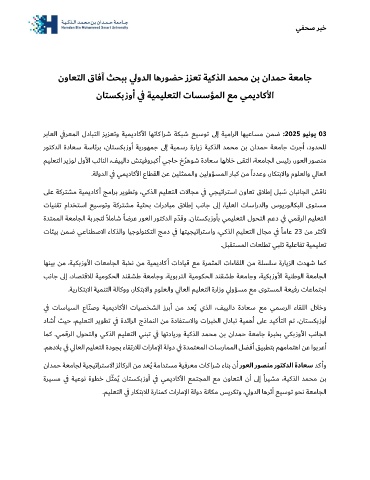 روتكدلا ةداعس ةسائرب ،ناتسكبزوأ ةيروهمج ىلإ ةيمسر ةرايز ةيكذلا دمحم نب نادمح ةعماج ترجأ ،دودحلل