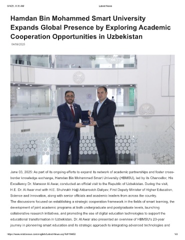 educational transformation in Uzbekistan. Dr. Al Awar also presented an overview of HBMSU’s 23-year