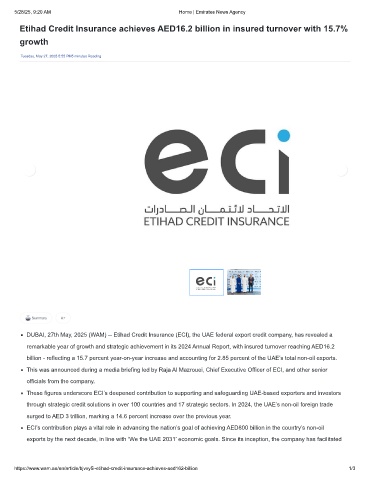 DUBAI, 27th May, 2025 (WAM) -- Etihad Credit Insurance (ECI), the UAE federal export credit company, has revealed a