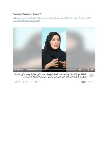 Publication: Facebook – Emarat TV Link: ريبخ ،يدامحلا ةمطاف ةروتكدلا ؟ةيبلس نوكت ىتمو ةيباجيإ نوكت ىتم ..ةيجوزلا ةايحلا ىلع اهريثأتو ءاقدصلأا عم ةقلاعلا ..ةيرسلأا ةيمنتلا ةسسؤم - يرسأو يعامتجا