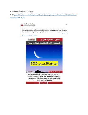 Publication: Facebook – UAE Barq Link: نابعش 29 ةعمجلا موي ءاسم ،ـه1446 ماعل ناضمر رهش للاه يرحت ىلإ نيميقمو نينطاوم نم عمتجلما دارفأ وعدي يعرشلا ءاتفلإل تاراملإا سلجم 2025 رياربف 28 قفاولما ،ـه1446.