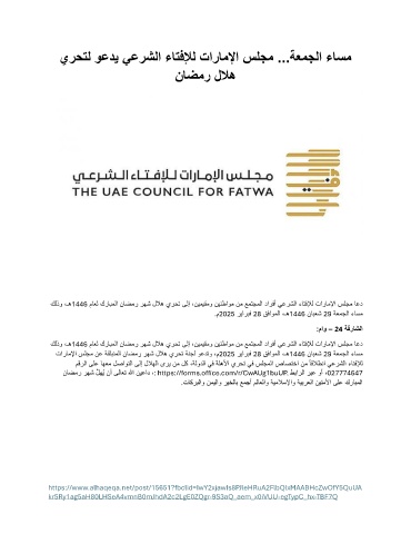 تاراملإا سلجم نع ةقثبنملا ناضمر رهش للاه يرحت ةنجل وعدتو ،م 2025 رياربف 28 قفاوملا ،ـه 1446 نابعش 29 ةعمجلا ءاسم