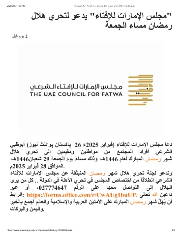 ﻲﺒظﻮﺑأ (زﻮﯿﻧ ﭧﻨﺋاﻮﭘ نﺎﺘﺴﮐﺎﭘ 26 ء2025 ﺮﯾاﺮﺒﻓ) ءﺎﺘﻓﻺﻟ تارﺎﻣﻹا ﺲﻠﺠﻣ ﺎﻋد