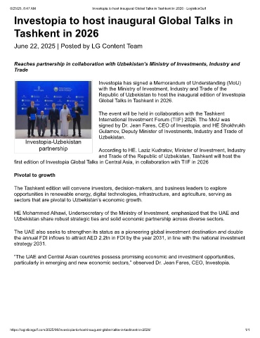 6/25/25, 8:47 AM Investopia to host inaugural Global Talks in Tashkent in 2026 - LogisticsGulf