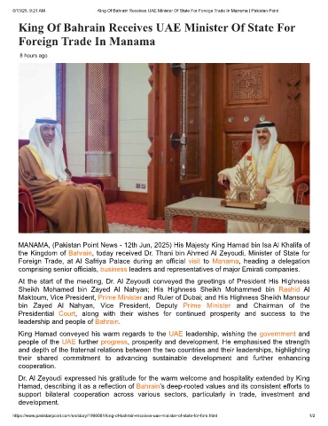 6/13/25, 9:21 AM King Of Bahrain Receives UAE Minister Of State For Foreign Trade In Manama | Pakistan Point