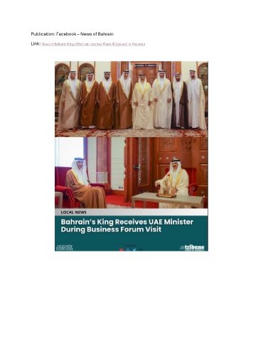 Publication: Facebook – News of Bahrain Link: News of Bahrain: King of Bahrain receives Thani Al Zeyoudi in Manama