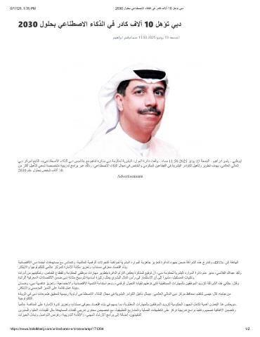 ةدﺎﯾﺮﻟا ﻲﻓ ﻲﺑد تﺎﺣﻮﻤط ﻖﯿﻘﺤﺘﻟ ﺔﯿﺴﯿﺋر ﺔﯾﻮﻟوأ ﻲﻋﺎﻨﻄﺻﻻا ءﺎﻛﺬﻟا لﺎﺠﻣ ﻲﻓ ﺔﯾﺮﺸﺒﻟا رداﻮﻜﻟا ﻞﯿھﺄﺗ ﻞﺜﻤﯾ» :ﻲﻤﻟﺎﻌﻟا ﻲﻟﺎﻤﻟا ﻲﺑد ﺰﻛﺮﻣ ﻆﻓﺎﺤﻣ ،ﻢظﺎﻛ ﻰﺴﯿﻋ لﺎﻗ ،ﮫﺒﻧﺎﺟ ﻦﻣ