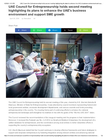 4/29/25, 3:15 PM  UAE Council for Entrepreneurship holds second meeting highlighting its plans to enhance the UAE's business environment and sup…