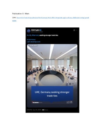 Publication: X - Wam Link: Wam: HE Dr Thani Al Zeyoudi meets PM of Germany’s North-Rhine Westphalia region to discuss collaboration in high-growth sectors