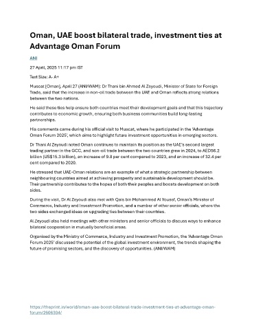 Muscat [Oman], April 27 (ANI/WAM): Dr Thani bin Ahmed Al Zeyoudi, Minister of State for Foreign