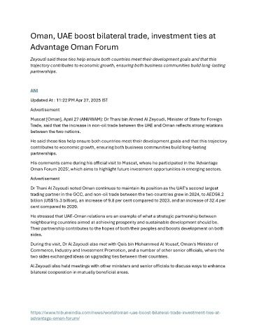 Muscat [Oman], April 27 (ANI/WAM): Dr Thani bin Ahmed Al Zeyoudi, Minister of State for Foreign