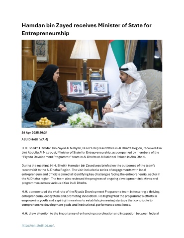 H.H. Sheikh Hamdan bin Zayed Al Nahyan, Ruler's Representative in Al Dhafra Region, received Alia