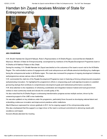4/25/25, 2:15 PM Hamdan bin Zayed receives Minister of State for Entrepreneurship – The Gulf Time Newspaper