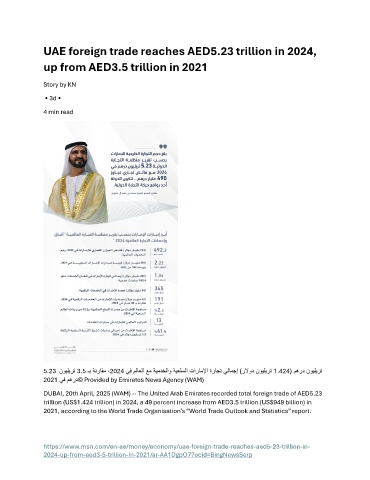 DUBAI, 20th April, 2025 (WAM) -- The United Arab Emirates recorded total foreign trade of AED5.23
