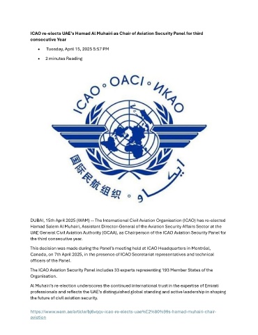DUBAI, 15th April 2025 (WAM) -- The International Civil Aviation Organisation (ICAO) has re-elected