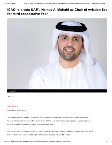 4/21/25, 4:28 PM ICAO re-elects UAE’s Hamad Al Muhairi as Chair of Aviation Security Panel for third consecutive Year - Aletihad News Center