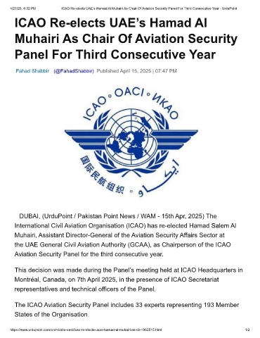 4/21/25, 4:32 PM ICAO Re-elects UAE’s Hamad Al Muhairi As Chair Of Aviation Security Panel For Third Consecutive Year - UrduPoint