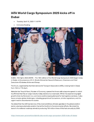 DUBAI, 15th April, 2025 (WAM) -- The 18th edition of the World Cargo Symposium 2025 began today