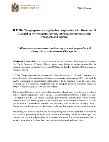 Abu Dhabi, 7 April 2025 - H.E. Abdulla bin Touq Al Marri, Minister of Economy, met with H.E.