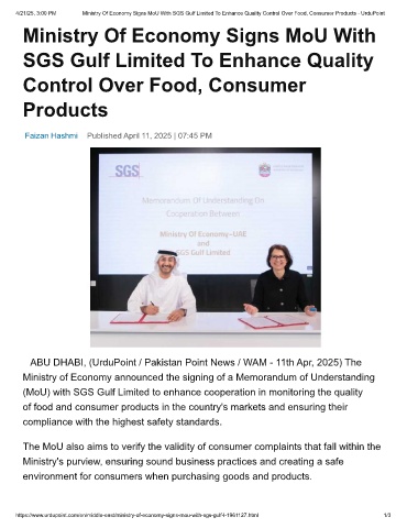4/21/25, 3:00 PM Ministry Of Economy Signs MoU With SGS Gulf Limited To Enhance Quality Control Over Food, Consumer Products - UrduPoint
