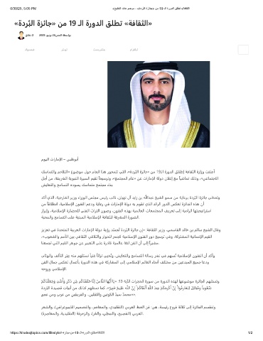 ﺰﻳﺰﻌﺗ ﻲﻓ ةﺪﺤﺘﻤﻟا ﺔﻴﺑﺮﻌﻟا تارﺎﻣإلا ﺔﻟود ﺔﻳؤر ﺪﺴﺠ ُ ﺗ ةدﺮﺒﻟا ةﺰﺋﺎﺟ نإ» :ﺔﻓﺎﻘﺜﻟا ﺮﻳزو ،ﻲﻤﺳﺎﻘﻟا ﺪﻟﺎﺧ ﻦﺑ ﻢﻟﺎﺳ ﺦﻴﺸﻟا لﺎﻗو