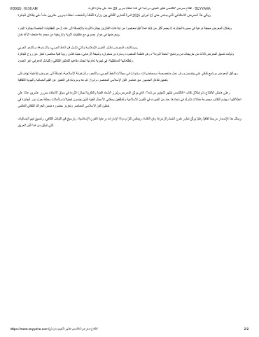 ﻰﻟإ فﺪﮭﺗ ﺔﯿﻠﻋﺎﻔﺗ ضوﺮﻋ ﻰﻟإ ً ﺔﻓﺎﺿإ ،ﺔﯿﻣﻼﺳﻹا ﺔﻓﺮﺧﺰﻟاو ،ﺮﻌﺸﻟاو ،ﻲﺑﺮﻌﻟا ﻂﺨﻟا تﻻﺎﺠﻣ ﻲﻓ تاوﺪﻧو ،تاﺮﺿﺎﺤﻣو ،ﺔﺼﺼﺨﺘﻣ ﻞﻤﻋ شرو ﻦﻤﻀﺘﯾ ﻲﻨﻏ ﻲﻓﺎﻘﺛ ﺞﻣﺎﻧﺮﺑ ضﺮﻌﻤﻟا ﻖﻓاﺮﯾو