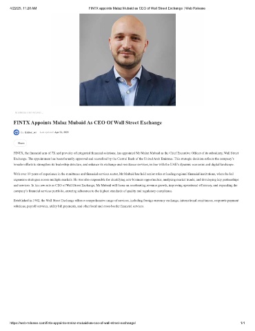 4/22/25, 11:28 AM FINTX appoints Malaz Mubaid as CEO of Wall Street Exchange | Web Release