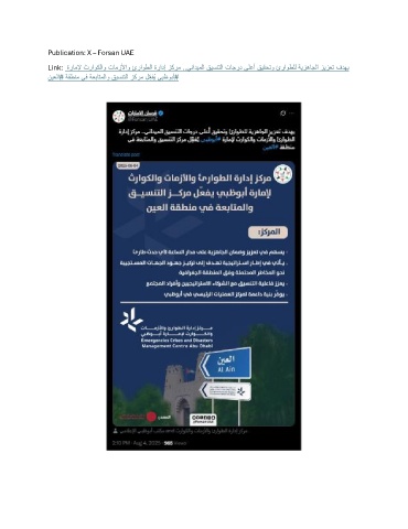 Publication: X – Forsan UAE Link: ةراملإ ثراوكلاو تامزلأاو ئراوطلا ةرادإ زكرم ..يناديملا قيسنتلا تاجرد ىلعأ قيقحتو ئراوطلل ةيزهاجلا زيزعت فدهب نيعلا# ةقطنم يف ةعباتملاو قيسنتلا زكرم لّ عفُي يبظوبأ#
