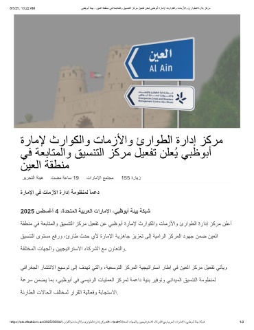 8/5/25, 10:22 AM ﻲﺑظوﺑأ ﺔﺋﯾﺑ - نﯾﻌﻟا ﺔﻘطﻧﻣ ﻲﻓ ﺔﻌﺑﺎﺗﻣﻟاو ﻖﯾﺳﻧﺗﻟا زﻛرﻣ لﯾﻌﻔﺗ نﻠﻌُﯾ ﻲﺑظوﺑأ ةرﺎﻣﻹ ثراوﻛﻟاو تﺎﻣزﻷاو ئراوطﻟا ةرادإ زﻛرﻣ