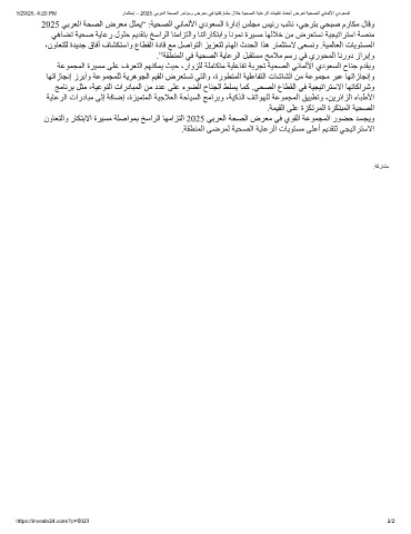 1/29/25, 4:20 PM رﺎﻣﺛﺗﺳإ – 2025 ﻲﺑرﻌﻟا ﺔﺣﺻﻟا رﻣﺗؤﻣو ضرﻌﻣ ﻲﻓ ﺎﮭﺗﻛرﺎﺷﻣ لﻼﺧ ﺔﯾﺣﺻﻟا ﺔﯾﺎﻋرﻟا تﺎﯾﻧﻘﺗ ثدﺣأ ضرﻌﺗ ﺔﯾﺣﺻﻟا ﻲﻧﺎﻣﻟﻷا يدوﻌﺳﻟا