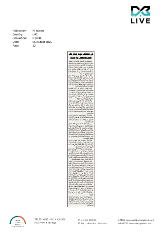 Publication: Al Watan Country: UAE Circulation: 83,000 Date: 06 August 2025 Page: 12 TELEPHONE: +971 4 4562888 P.O.BOX: 500266 E-MAIL: business@orientplanet.com FAX: +971 4 4549528 Dubai, United Arab Emirates WEBSITE: www.orientplanet.com