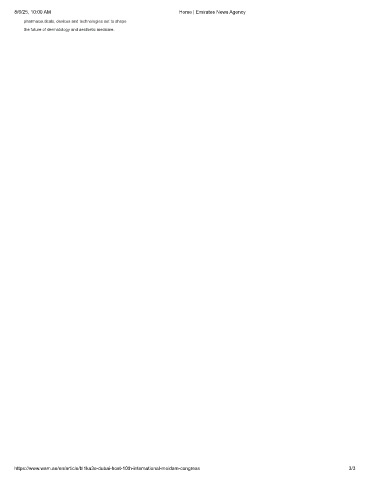 8/6/25, 10:00 AM Home | Emirates News Agency pharmaceuticals, devices and technologies set to shape the future of dermatology and aesthetic medicine. https://www.wam.ae/en/article/bl1ka3e-dubai-host-10th-international-meidam-congress 3/3
