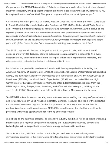 8/6/25, 10:01 AM  Dubai Strengthens Its Role as a Leading Hub for Dermatology with the 10th International MEIDAM Congress - Middle East Busines…