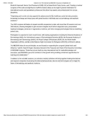 Khalid Al Hammadi, Senior Vice President of DXB LIVE at Dubai World Trade Centre, said, "Hosting a medical