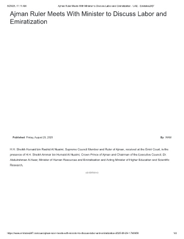 https://www.emirates247.com/uae/ajman-ruler-meets-with-minister-to-discuss-labor-and-emiratization-2025-08-29-1.740958 1/2